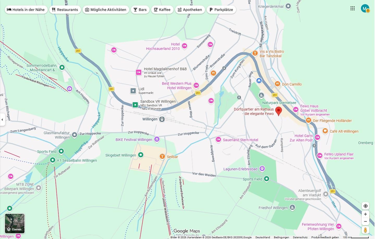 Die 3-Sterne Wohnung befindet sich im Herzen von Willingen - direkt hinterm Rathaus in Hanglage innerhalb einer terrassenförmigen Appartementanlage. Mit kurzen Laufwegen in die Ortsmitte (100m) und zur Kneipenmeile/Nachtleben (200m) ist diese Fewo ideal für Nachtschwärmer, Kurzurlauber und in den Ferien für Familien, welche gern mittendrin wohnen und alles in kurzer Entfernung erreichen möchten. An Wochenenden ist es im Zentrum dennoch bis in die späten Abendstunden recht lebhaft, wochentags ist es Abends ruhig.