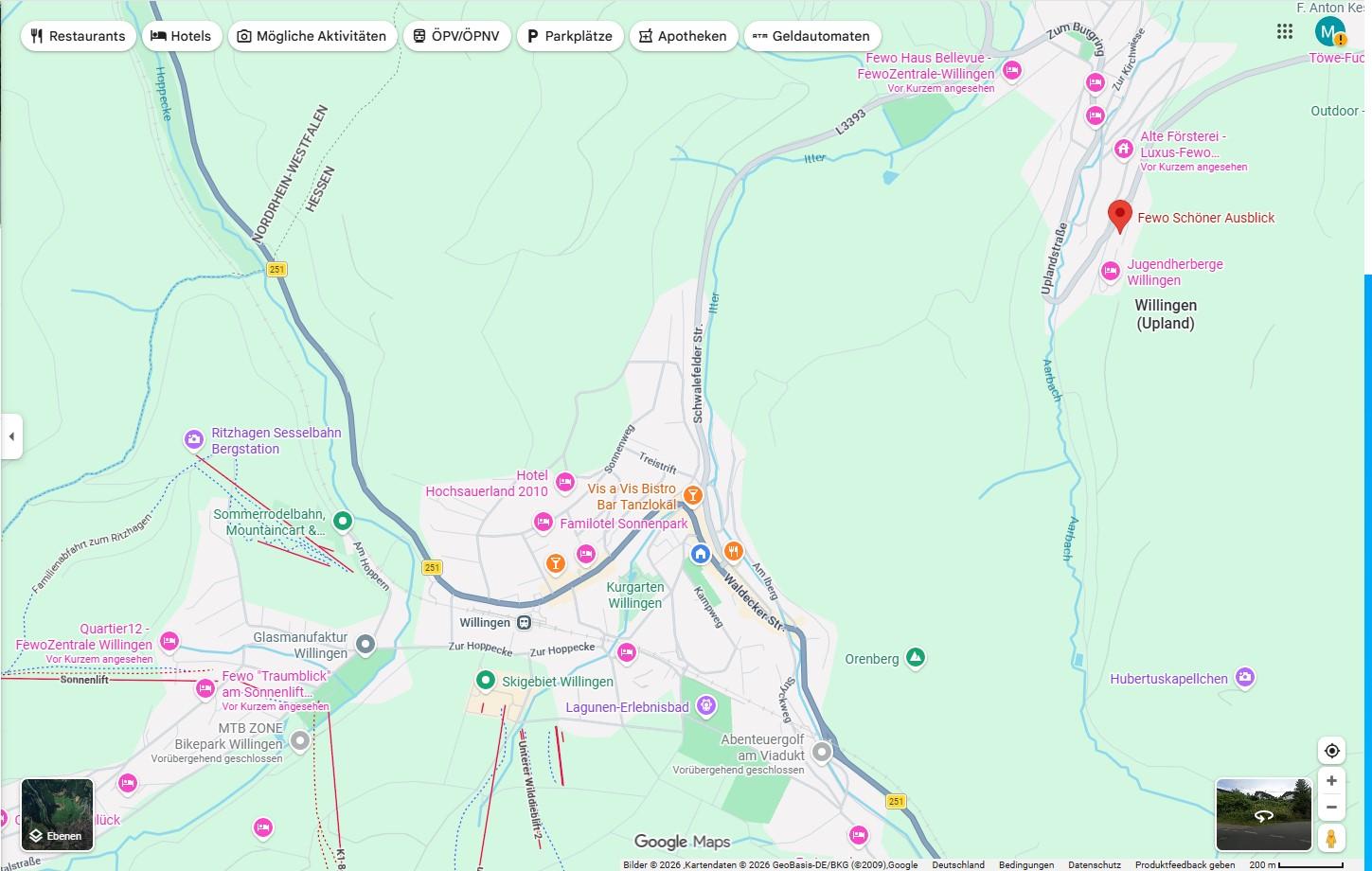 Die Fewo befindet sich in Höhenlage von Schwalefeld. Die Schwalefelder Ortsmitte mit Restaurants und Dorfladen erreichen Sie in wenigen Gehminuten. Ins Willinger Zentrum sind es ca. 4km und zum Diemelsee sind es mit dem PKW gerade mal 10 Minuten (10km). Genussurlauber, die Komfort, Ruhe und Naturnähe im Upland bevorzugen, finden hier wahrscheinlich ihr Lieblingsquartier.