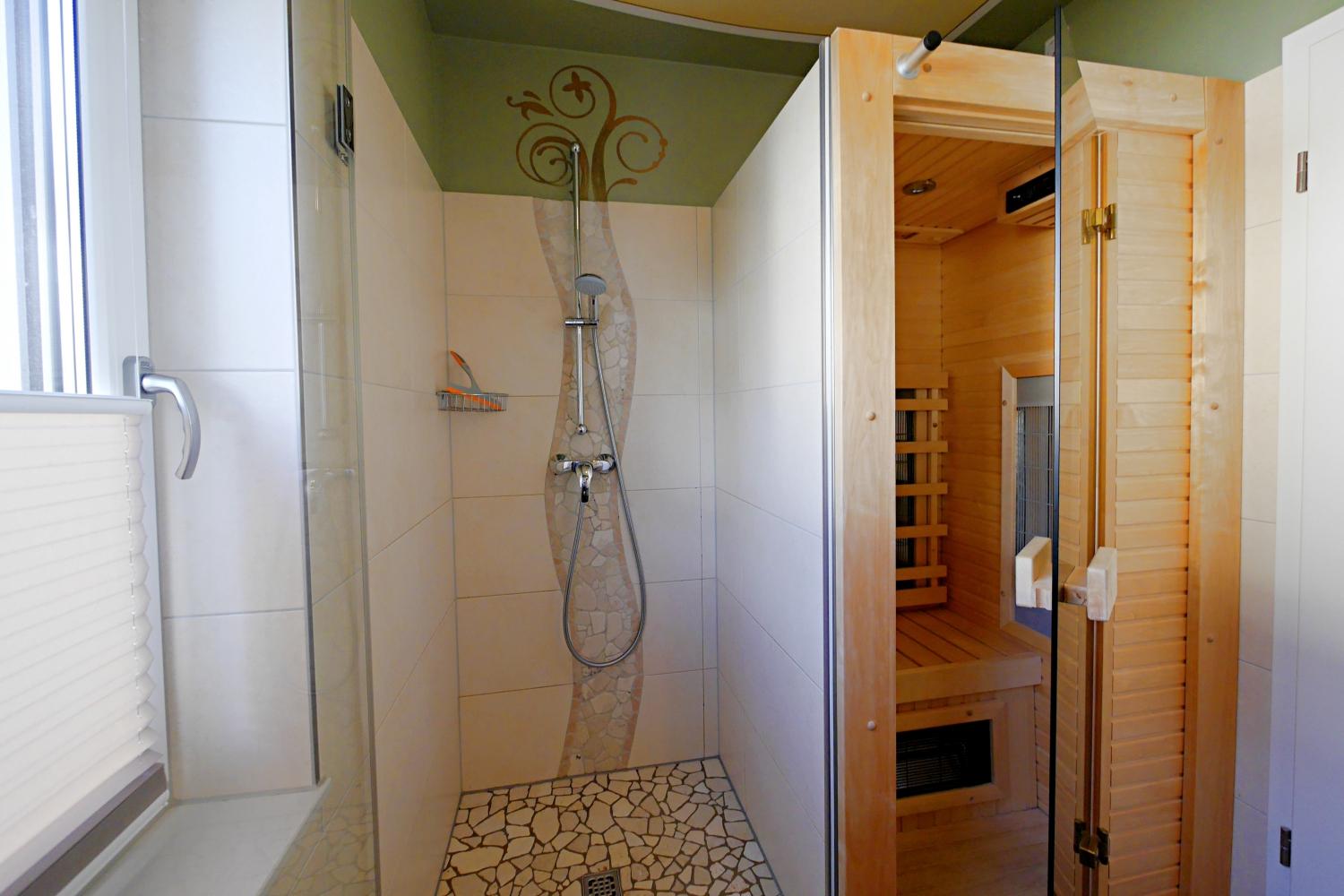- modernes Duschbad mit ebenerdiger Dusche, Infrarotkabine, Fenster und Fön