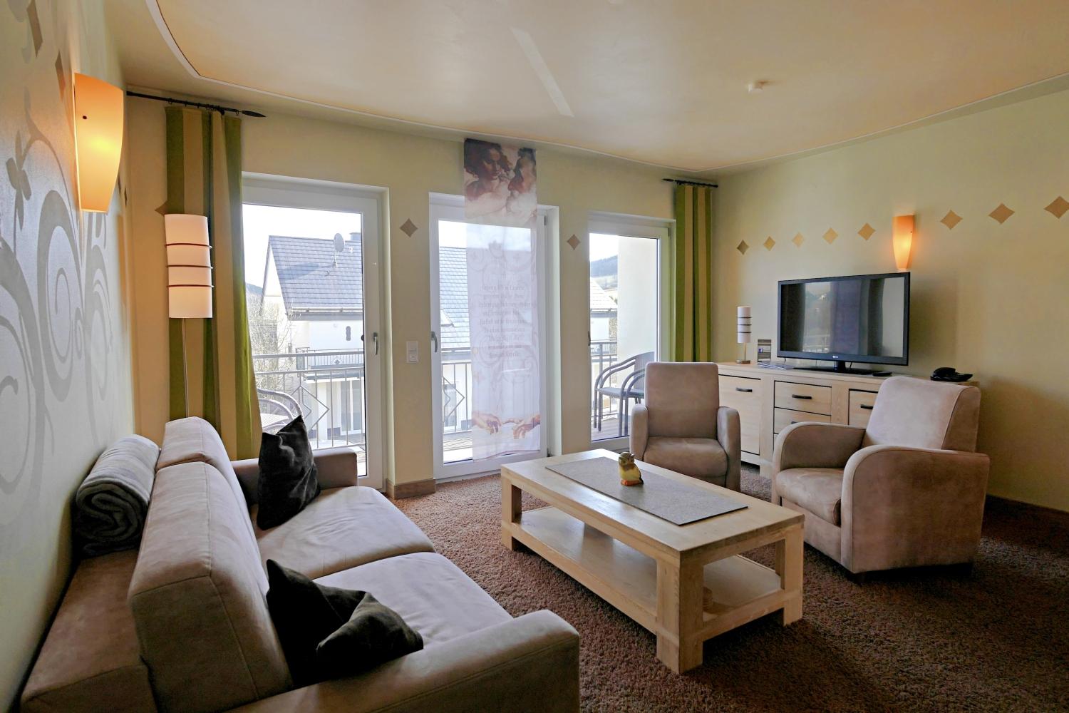 Ideal für Skifahrer, Familien und Wandergruppen mit Balkonblick auf den Ettelsberg und die Skipisten.