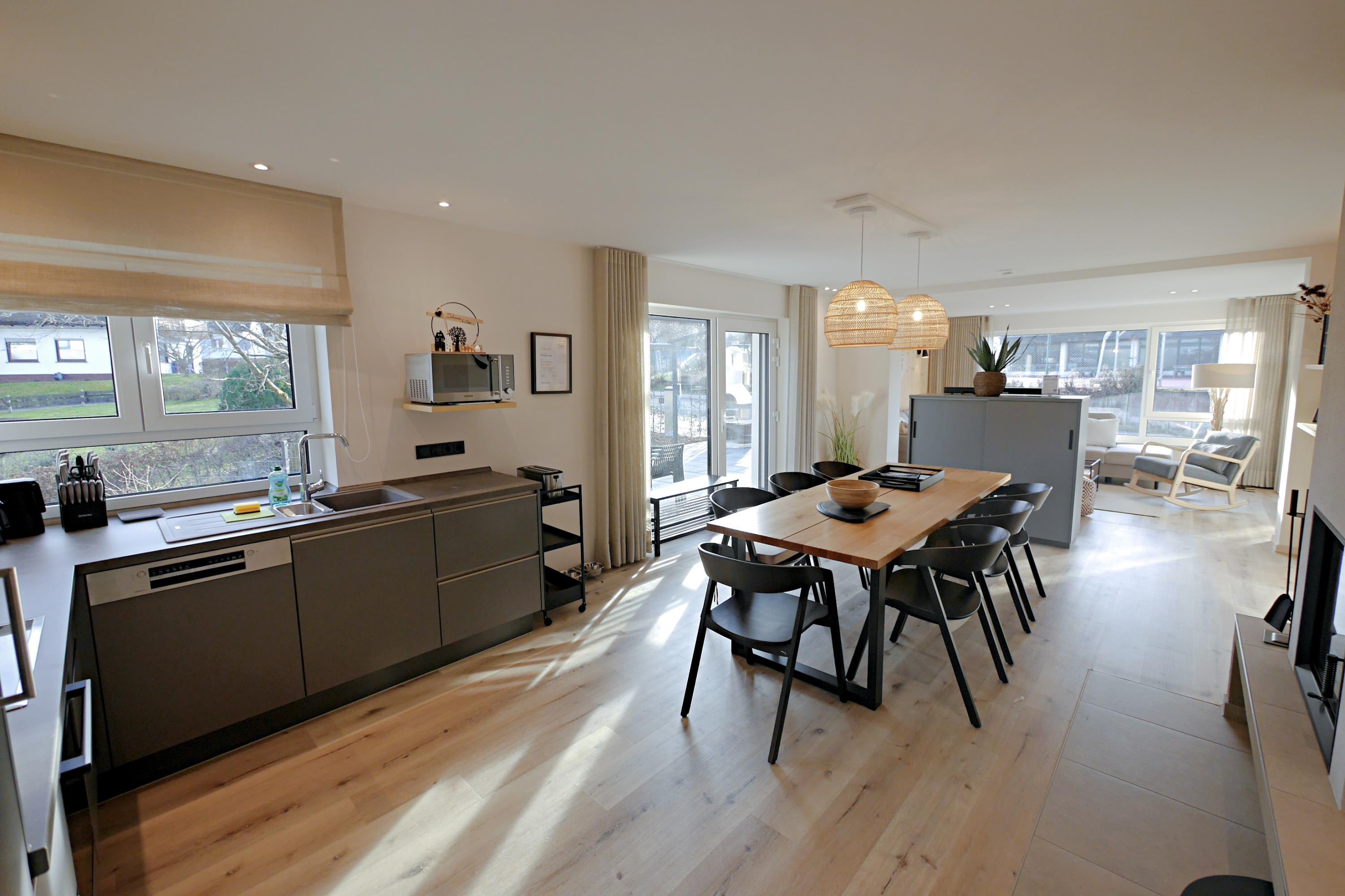 - Lichtdurchflutete Wohnküche mit großem Esstisch, Kamin, Zugang zur Terrasse und Küche