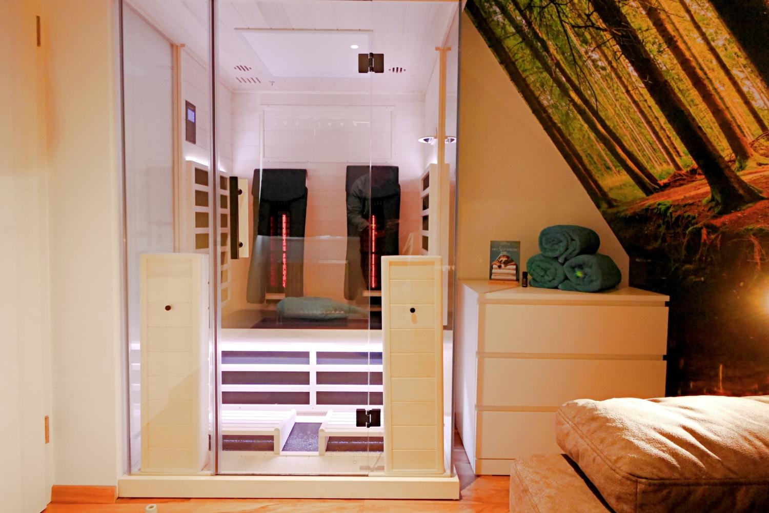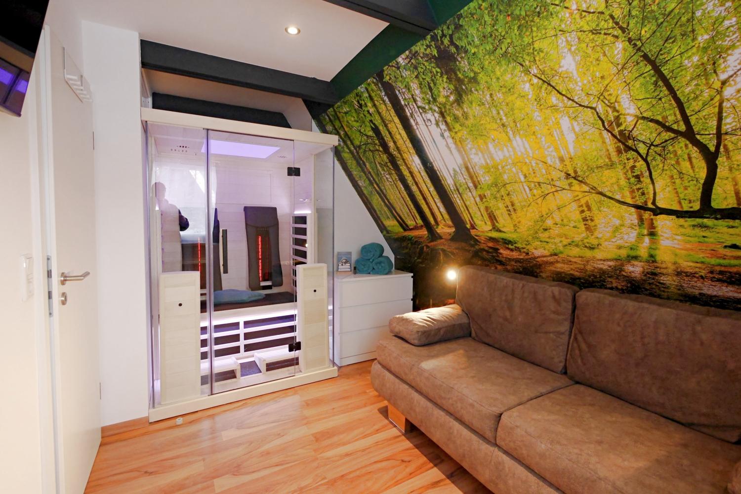 - variables Relax-Zimmer mit 2-Personen-Infrarotsauna, Relaxsofa und TV. Das Sofa ist wandelbar zur Schlafstätte für zusätzliche Personen 5-6.