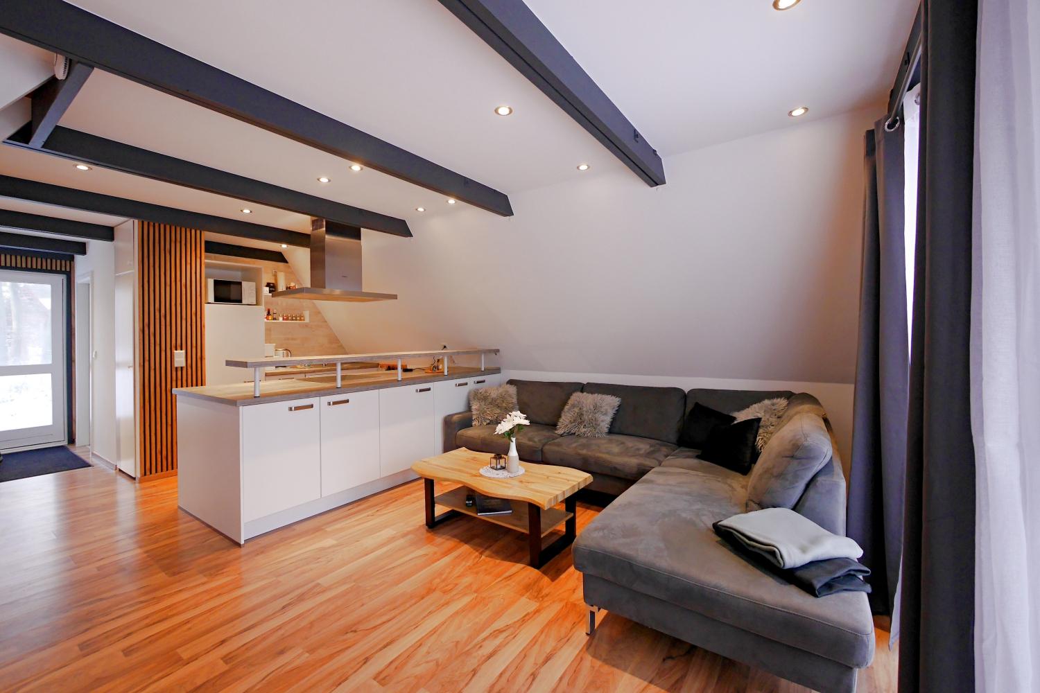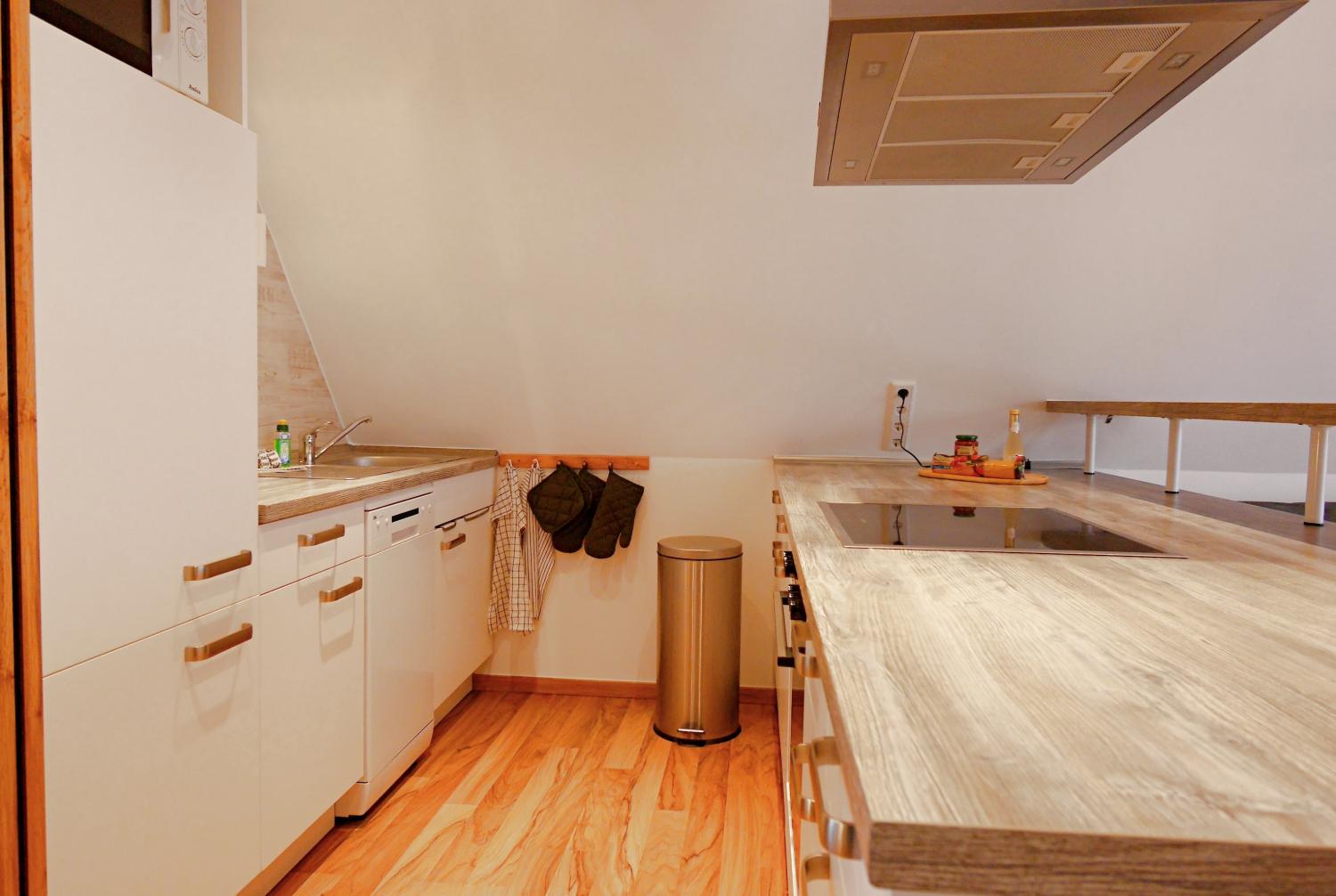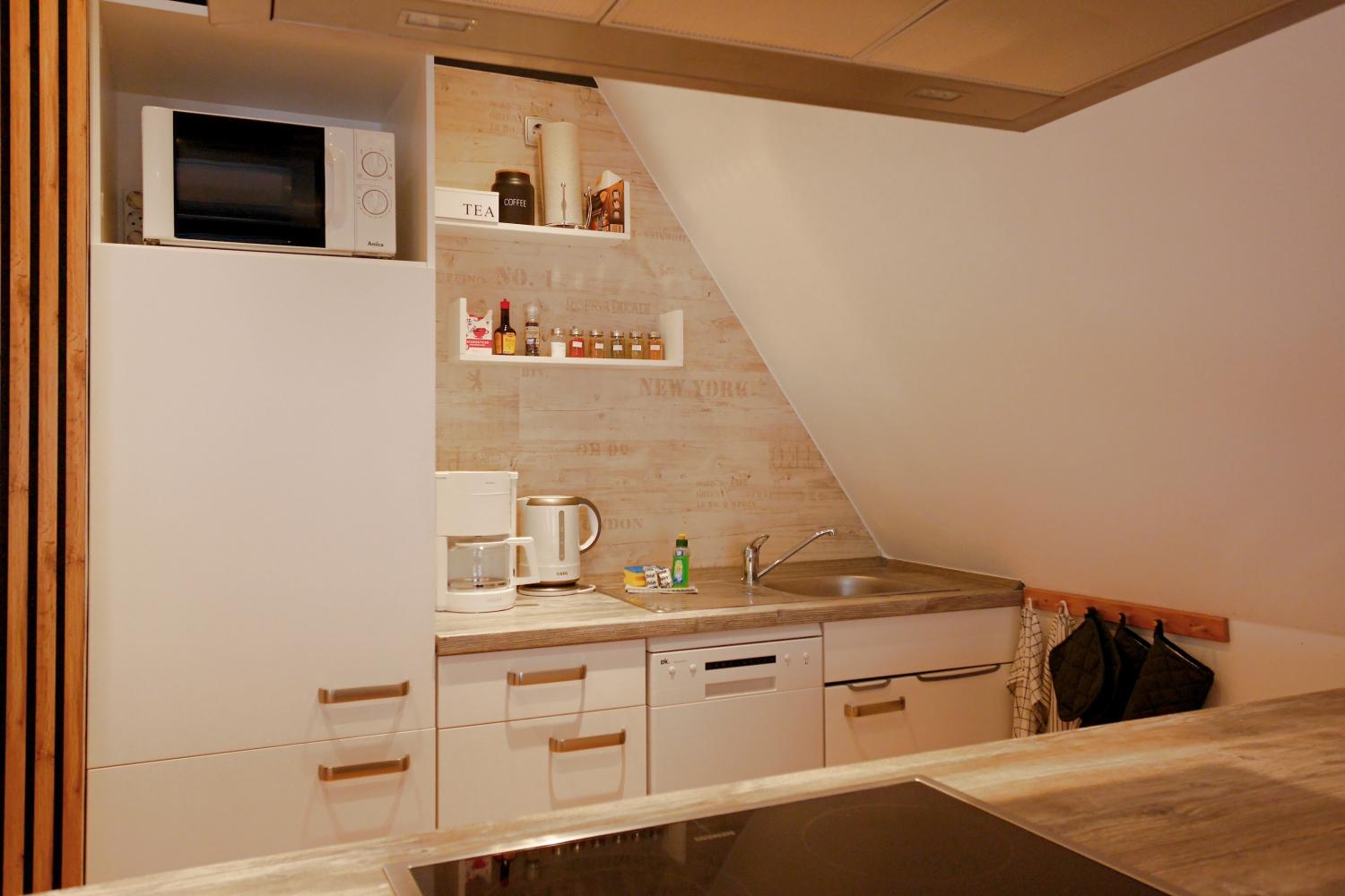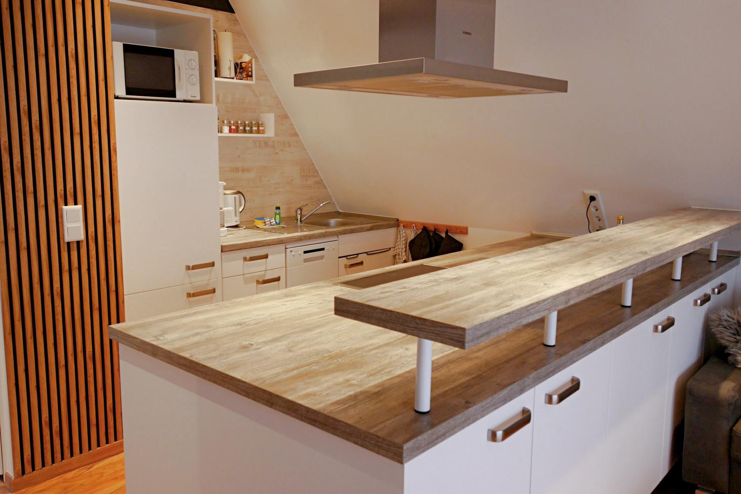 - offene Küche mit Theke und TOP-Ausstattung, die kaum Wünsche offen lässt: u.a. Mikrowelle, Geschirrspüler, Kaffeemaschine, PAD-Maschine, Wasserkocher, Toaster, Mixer, Waffeleisen/Sandwichtoaster