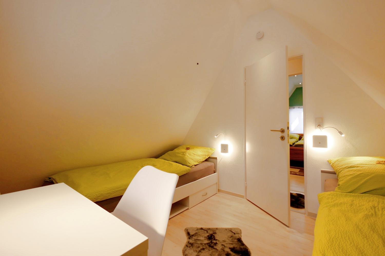 - zweites Schlafzimmer mit 2 Einzelbetten, Schreibtisch, TV und Soundanlage